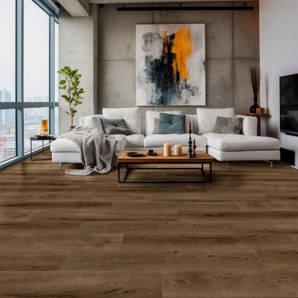 Golden Select®'s Java rigid core vinyl flooring brings edge to any space. Its cool, dark brown tone plays beautifully against both light and dark finishes, adding contrast that makes light colours pop and darker elements feel more refined. It brings just the right amount of boldness without feeling heavy. The result is a modern look that feels sharper, sleeker, and full of style.