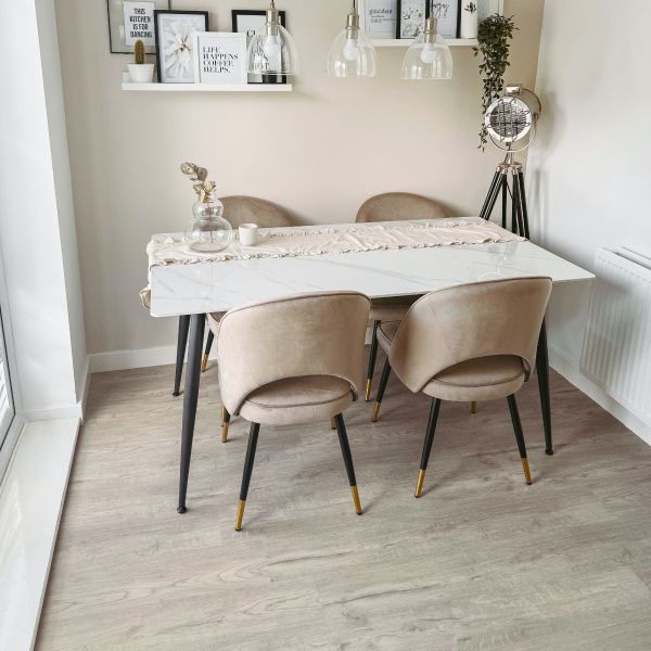 This soft, cream colored floor is perfect for creating a peaceful space. Golden Select's Rigid Core Vinyl Flooring Alabaster is a great backdrop for all types of décor and will match almost anything.